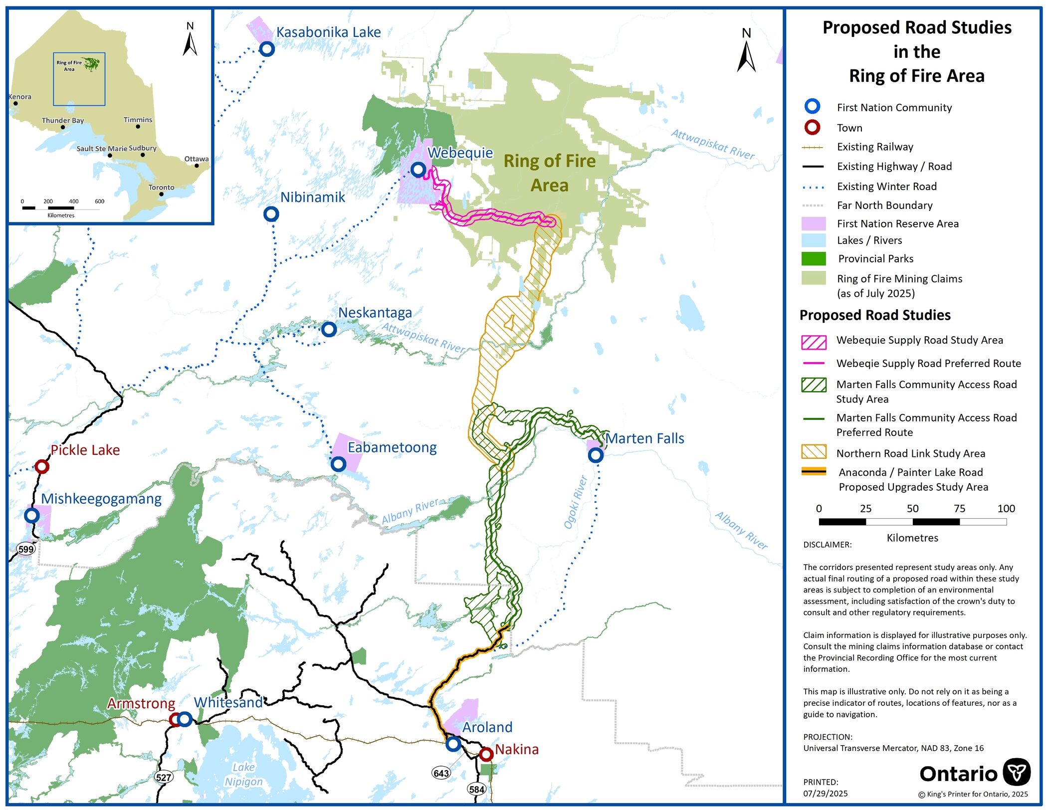 This map shows proposed road study areas and routes in the Ring of Fire region. It also shows First Nation communities, existing roads, winter roads and railway lines.