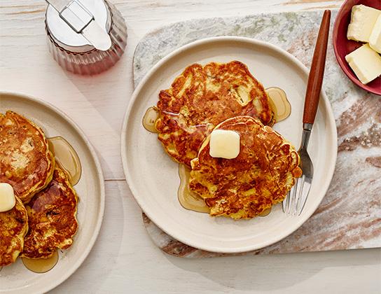 Heat just enough oil to coat bottom of nonstick skillet over medium-high heat until hot. Spoon about 1/3 cup (75 mL) batter for each pancake into pan. Cook for about 3 minutes or until bottom is deep golden-brown underneath; flip and cook for 3 more minutes or until bottom is deep golden. Repeat with remaining batter. Discard cinnamon and cloves from spiced maple syrup. Serve with pancakes spiced syrup and butter, if desired.