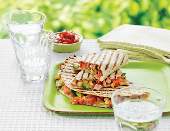 Preheat barbecue to medium heat. In medium bowl, stir together corn, tomato, red pepper, Monterey Jack and Cheddar cheeses, ham, coriander and salsa. Lay tortillas on baking sheet. Spoon about 1/2 cup (125 mL) filling on half of each; fold over to form semicircle.