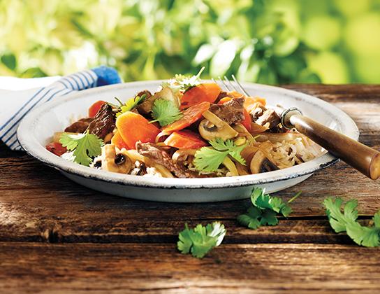 In wok or large deep skillet, heat 1 tbsp (15 mL) of the oil over high heat. Add beef mixture and stir-fry until meat is browned but still pink inside, about 3 minutes. Remove to bowl. Add remaining oil to wok; stir-fry onion and carrots for 3 minutes. Add mushrooms; stir-fry for 3 minutes. Whisk soy sauce mixture and stir into wok along with beef and any accumulated juices and bean sprouts. Stir-fry until mixture comes to a boil and thickens. Sprinkle with coriander leaves.