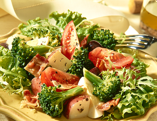 Arrange lettuce on individual plates or serving platter. Arrange broccoli mixture, tomatoes, eggs, bacon and olives on lettuce; drizzle with remaining dressing. Serve at room temperature.