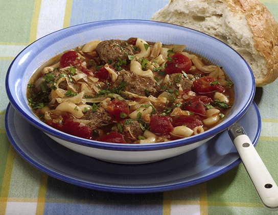 In same pan, cook cabbage and onions over medium-low heat for 5 minutes, stirring often. Stir in stock, tomatoes, thyme, sugar and bay leaf. Return meatballs to pan, bring to boil, cover, reduce heat and simmer for 30 minutes, adding macaroni for last 15 minutes. Serve in heated bowls, garnish with remaining 2 tbsp (25 mL) parsley.