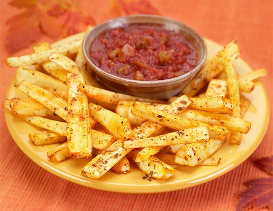 Peel parsnips and cut into French-fry-size pieces. Place on parchment paper-lined baking sheet. Toss with 1 tsp (5 mL) of the oil; spread out in single layer.