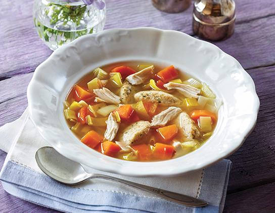 In large pot, combine carrots, leek, garlic, bay leaves and broth; bring to boil. Stir in chicken, reduce heat, cover and simmer until vegetables are tender, about 20 minutes. Season with salt and pepper to taste, if using.
