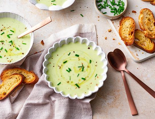 Melt butter in large skillet; add onion and cook about 5 minutes until softened. Add chicken broth and potatoes; cook, covered, about 15 minutes until potato is tender. Cool slightly; purée along with cucumber in blender in several small batches until smooth. Season to taste with salt and pepper. Refrigerate until well chilled; add cream. Serve sprinkled with chives.