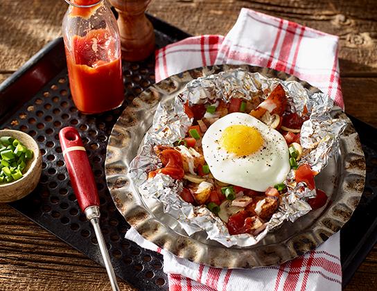 Open each foil package and top potatoes with cheese, bacon, tomato, mushrooms, green onions and egg. Sprinkle with pepper and serve with ketchup.