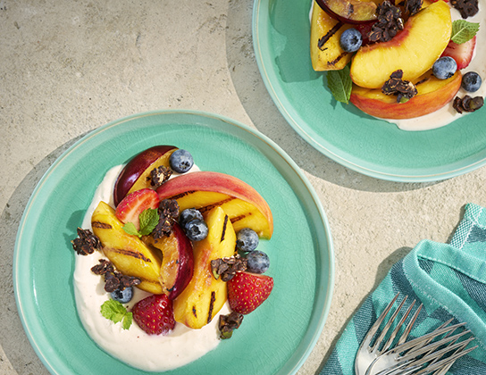 On each dessert plate, place one-quarter of the yogurt onto centre of plate. With the back of spoon, fan out yogurt into half-moon shape. Equally spoon grilled fruit wedges over top; sprinkle with berries and chocolate crunch. Garnish with mint.