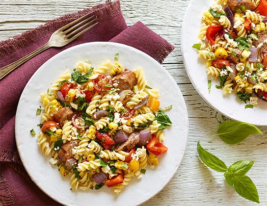 Diagonally slice sausages into bite-size pieces and add to pasta. Cut kernels from cob, chop pepper and onion; add to pasta along with feta and basil. Toss well.