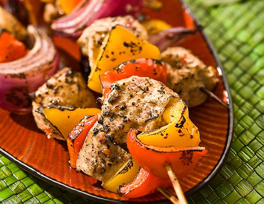 Alternately thread chicken, peppers and onion onto 8 metal or soaked wooden skewers, leaving space between pieces. Brush well with vegetable oil. Place on greased preheated grill over medium heat; close lid and cook for 10 to 12 minutes, turning over and brushing with oil partway, until chicken is no longer pink inside.