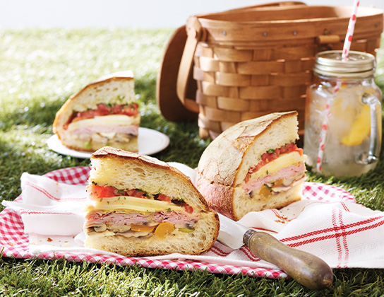 Spread mushroom mixture in cavity of bottom half. Arrange ham evenly over top; spread with mustard. Top with cheese slices and arrange tomatoes over top. Season with salt and pepper.