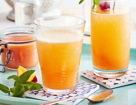 To serve, divide purée between four glasses. Top with sparkling water and stir to blend. Garnish with nectarine slice and mint.