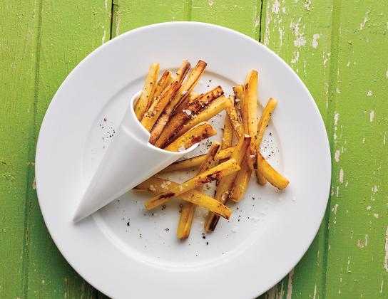 Peel and cut parsnips into long skinny ‘fries’; discard woody core.