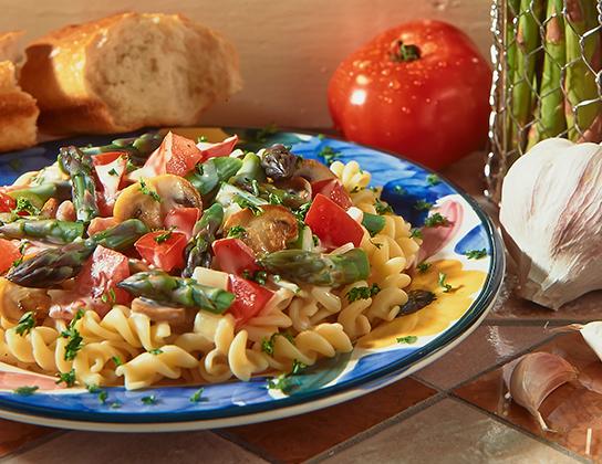 In same saucepan, heat oil over medium-high heat. Add onion, garlic, mushrooms, and tomatoes; cover and cook for about 5 minutes or until onion is softened. Stir in flour. Gradually stir in milk; cook, stirring, until thick enough to coat back of spoon, 3 to 5 minutes. Stir in basil, salt, nutmeg, pepper and reserved asparagus. Heat through.