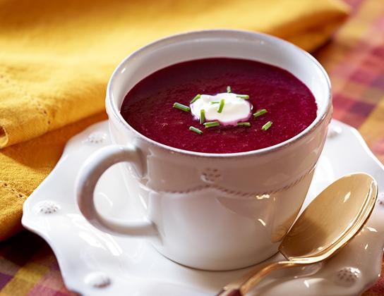 Peel beets, onion and potato. Shred in food processor fitted with shredding disk (or use a box grater). Place vegetables in large saucepan along with chicken broth and orange peel. Bring to boil; reduce heat and simmer 20 minutes or until vegetables are tender.