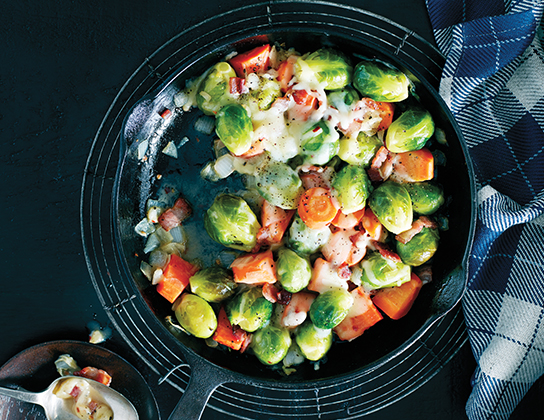 Drain all but 1 tbsp (15 mL) fat from skillet. To skillet, add onion, and hot pepper flakes (if using); cook over medium-low heat, stirring frequently, for 5 minutes or until softened but not browned. Stir in honey, mustard, salt and pepper. Add reserved Brussels sprouts and carrots; toss to coat well. Chop reserved bacon; sprinkle over top. Sprinkle with cheese. Bake on middle rack of 400°F (200°C) oven for 3 minutes or until cheese is melted.