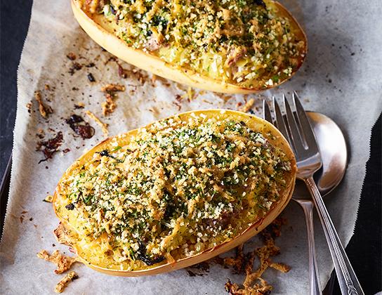 In small bowl, combine cheese, panko and parsley. Sprinkle cheese mixture evenly over squash halves. Bake in 375°F (190°C) oven until golden brown, about 25 minutes.