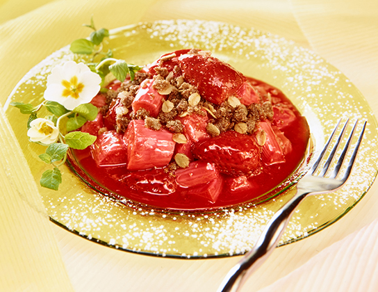 In large mixing bowl, combine strawberries and rhubarb. Stir in sugar, flour and cinnamon. Spoon into greased 13- x 9-inch (3 L) baking dish.