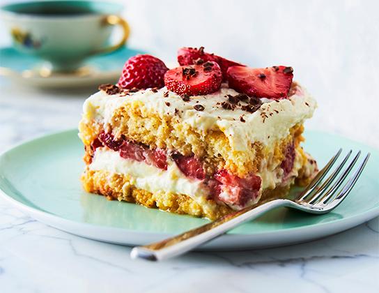 To serve, quarter or halve the remaining strawberries, scatter over tiramisu. Sprinkle with remaining chocolate. Cut in rectangles and serve.