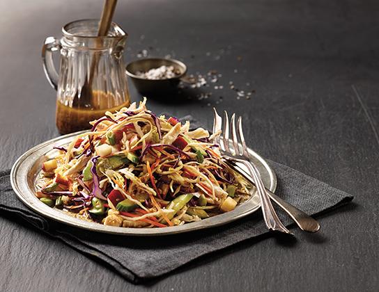 Remove skin from chicken and shred meat into strips. Set aside. In large bowl, toss shredded cabbages, green onions, carrots, cucumbers and apples with dressing. Add chicken and toss again. Serve immediately or cover and refrigerate for a couple of hours until ready to serve. Taste and adjust seasoning.