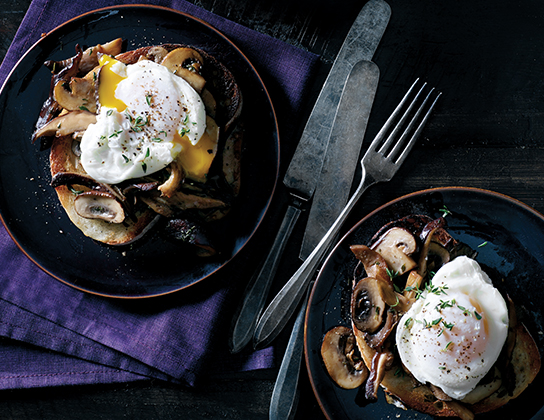 Meanwhile, toast bread; place slice on each plate. Season mushrooms with salt and pepper; spoon onto toast. Top each with poached egg. Sprinkle with pepper and thyme leaves.