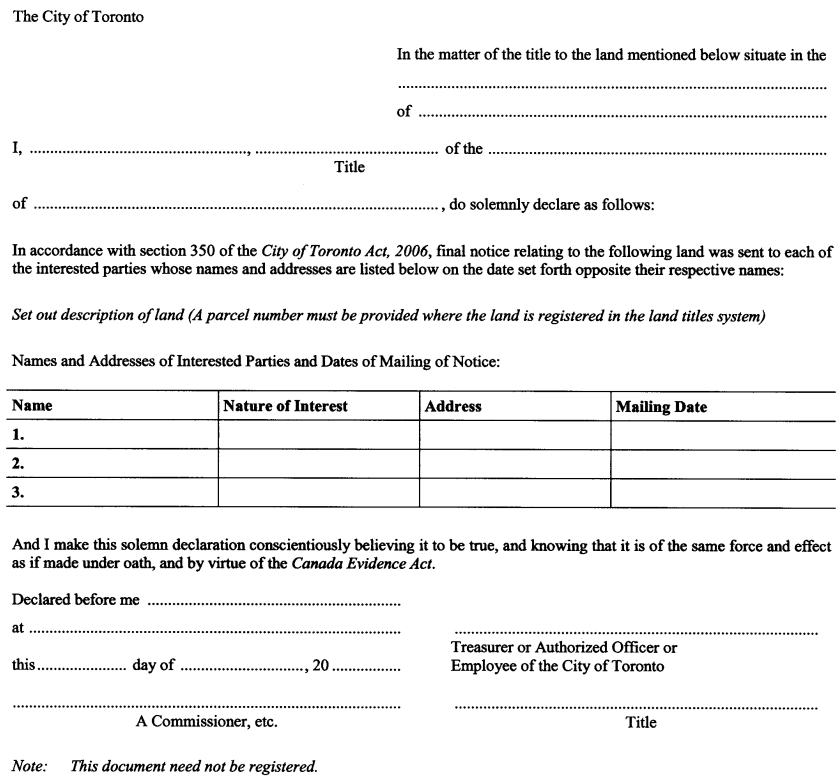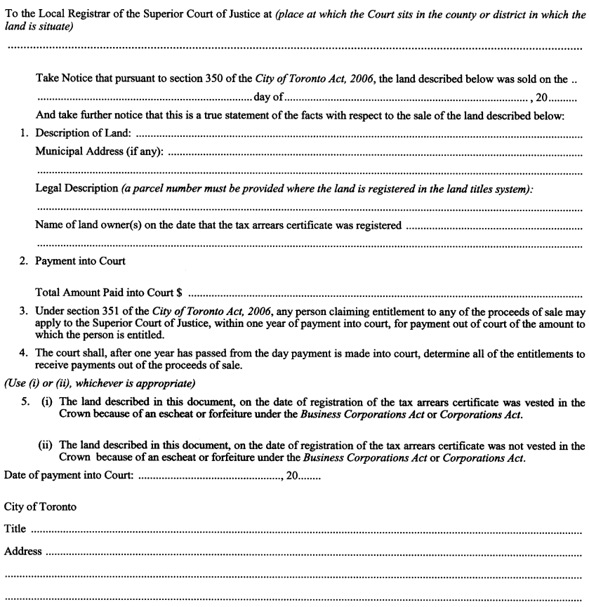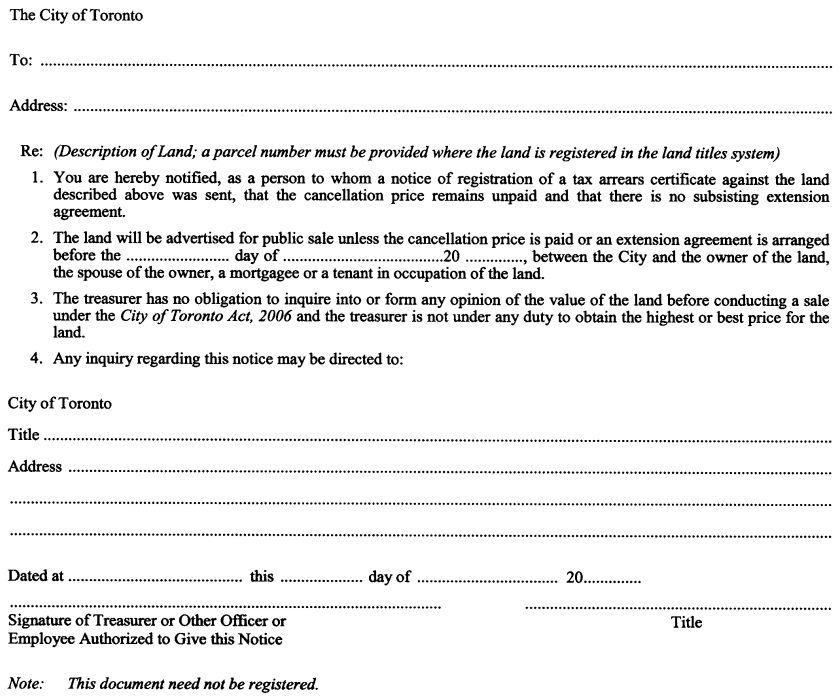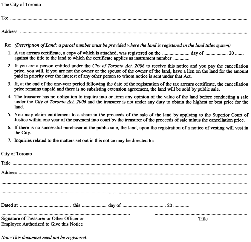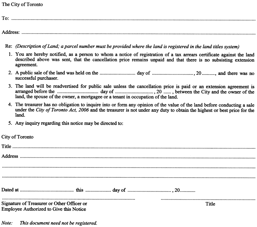 3. A statement that registration is made under the City of Toronto Act, 2006 and, under that Act, the City attempted to sell the land described in the notice of vesting for arrears of taxes but could not find a successful purchaser and, accordingly, the registration of the notice vests the land described in the notice of vesting in the City.