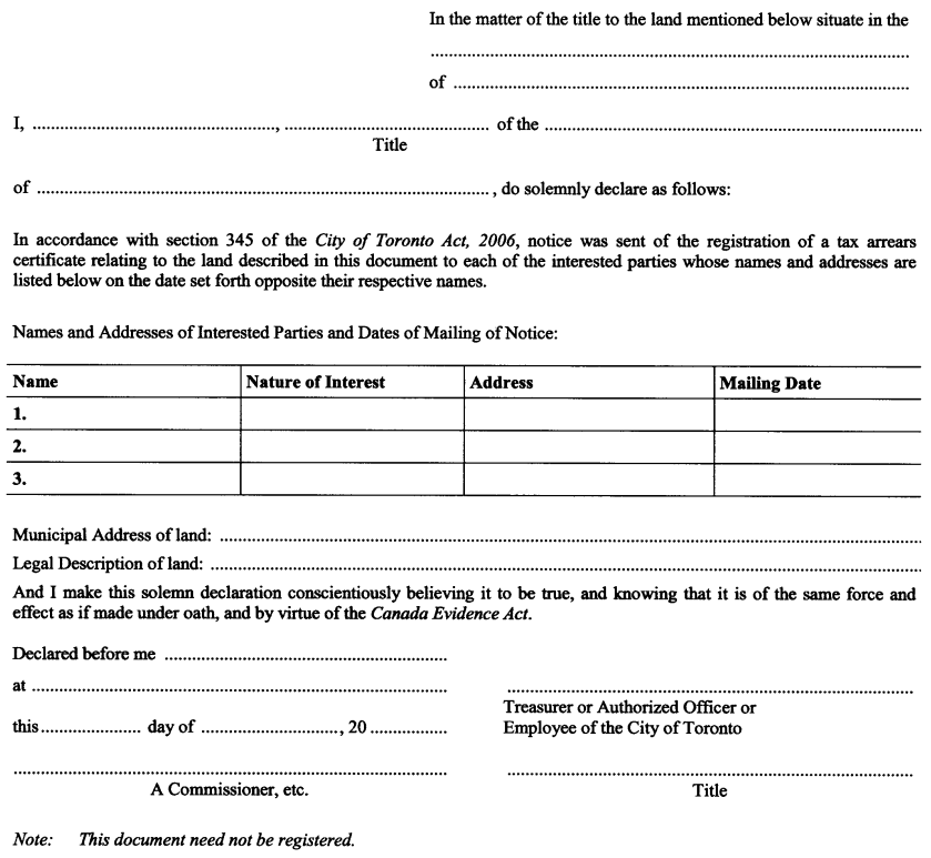 (2) A statutory declaration required by subsection 345 (3) of the Act shall be in Form 2. O. Reg. 579/06, s. 4 (2).