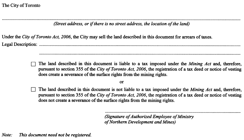 3. A statement that, by virtue of the City of Toronto Act, 2006, the registration of the tax deed vests in the transferee an estate in fee simple in the land together with all rights, privileges and appurtenances and free from all estates and interests except,
