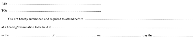 2. Every summons to a witness to appear before a person appointed to make an investigation under section 7 or 9 of the Act shall be in Form 1.
