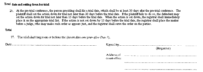 1. The plaintiff shall serve the statement of claim, together with the plaintiff’s affidavit of documents, the case information statement and the case management order, within thirty days after Day 1, and file them with proof of service within forty days after Day 1. However, proof of service is not required with respect to a defendant who files a statement of defence within forty-four days after Day 1. Copies of the documents referred to in Schedule A of the plaintiff’s affidavit of documents shall be served with the statement of claim and other documents, but shall not be filed.