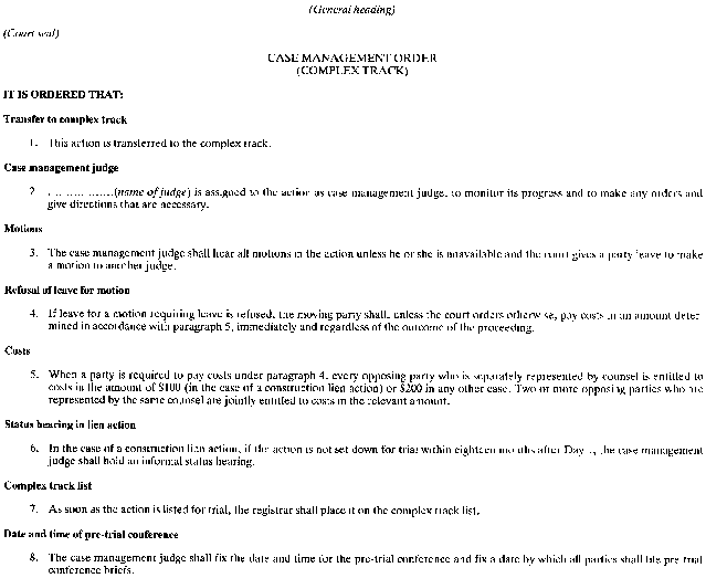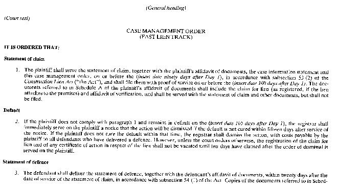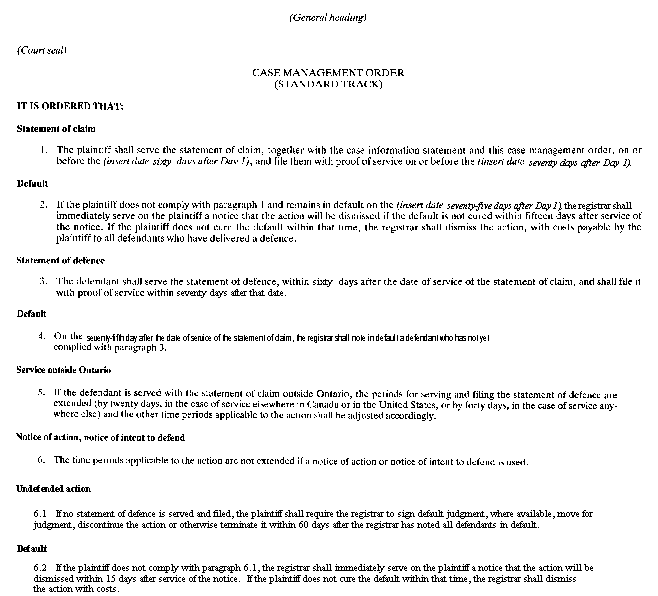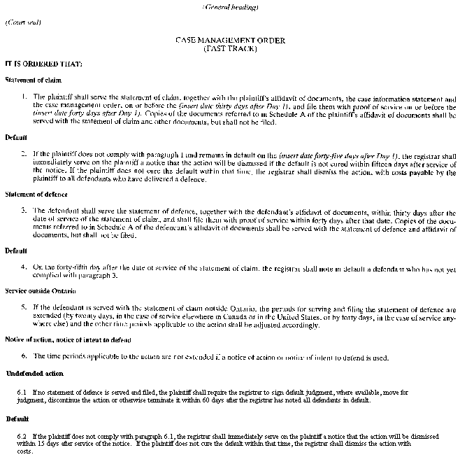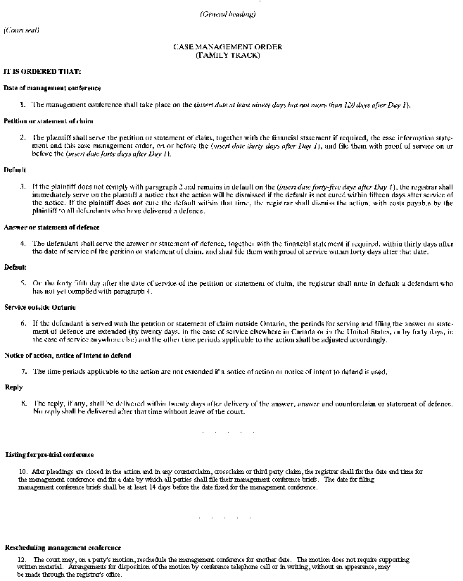 (2) When the plaintiff files the case information statement, the court shall make a case management order in Form 2 (fast track), Form 3 (standard track), Form 4 (family track) or Form 5 (fast lien track). R.R.O. 1990, Reg. 189, r. 5 (2).