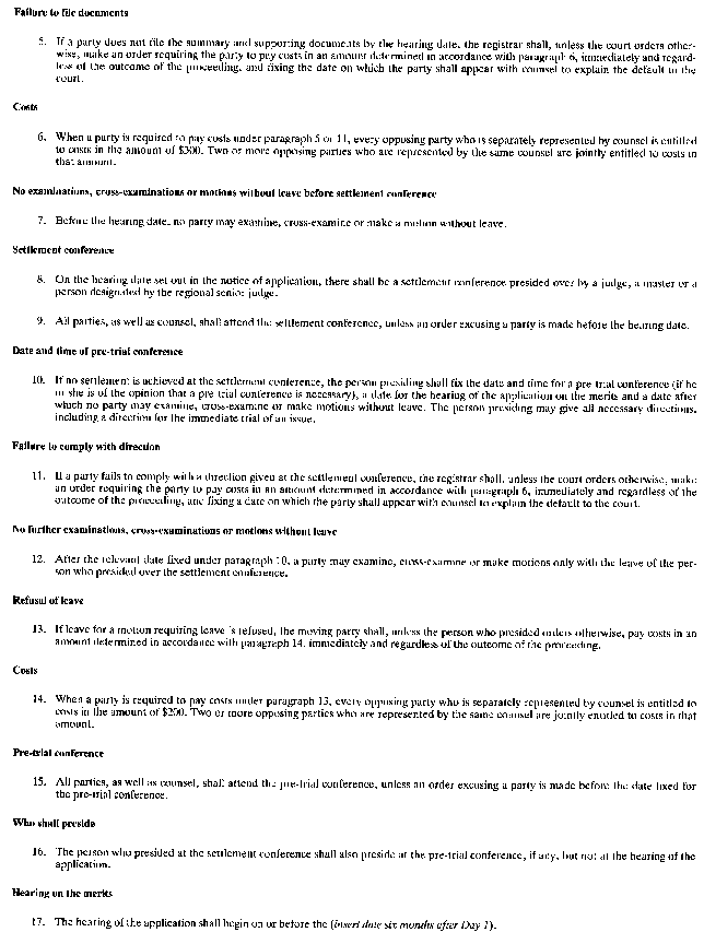5. If a party does not file the summary and supporting documents by the hearing date, the registrar shall, unless the court orders otherwise, make an order requiring the party to pay costs in an amount determined in accordance with paragraph 6, immediately and regardless of the outcome of the proceeding, and fixing a date on which the party shall appear with counsel to explain the default to the court.