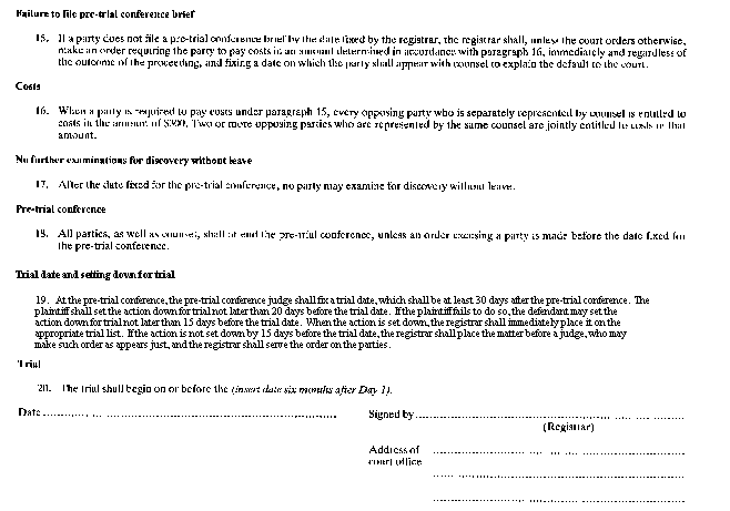 8. Paragraphs 10 to 17 of rule 7 (standard track), paragraphs 19 to 26 of rule 8 (family track), paragraph 10 of rule 9 (fast lien track) or paragraphs 1 to 10 of subrule 10 (2) (complex track), as the case may be, apply to the action with necessary modifications. R.R.O. 1990, Reg. 189, r. 15.