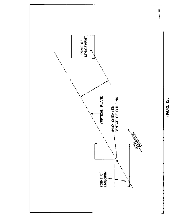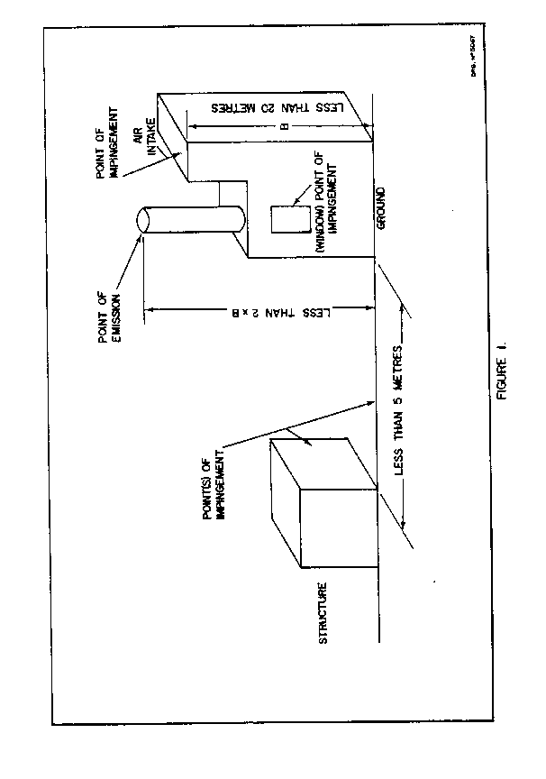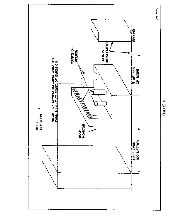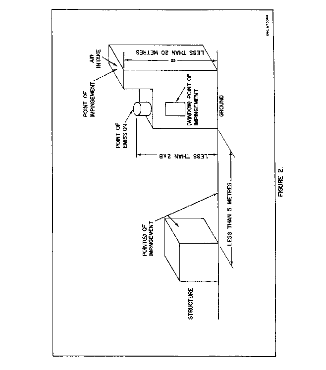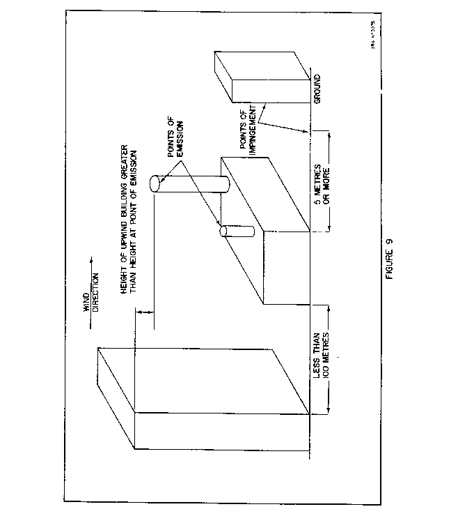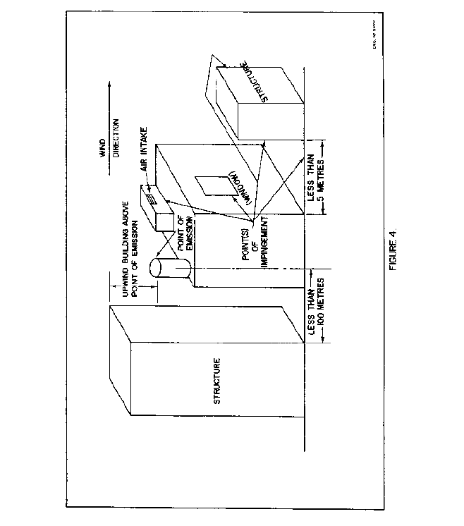 2. the building or structure is a horizontal distance of 100 metres or less from the point of emission, (see figures 9 and 10)