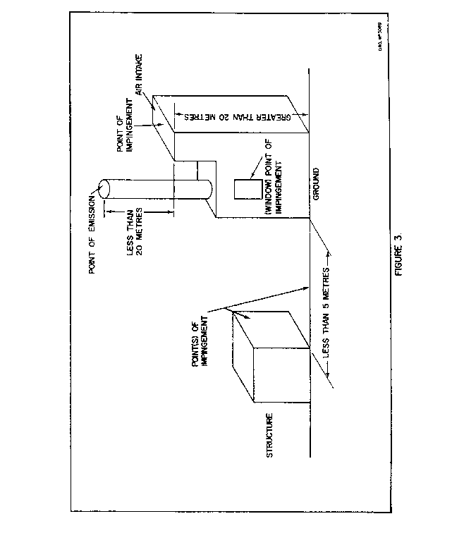 (ii) the height of the highest part of the building or structure on which the point of emission is located is greater than twenty metres above grade and the point of emission is less than twenty metres above the highest part of the building or structure on which it is located, or (see figure 3)