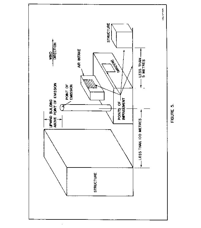 (b) where the point of impingement is a horizontal distance of five metres or more from the building or structure on which the point of emission is located and,