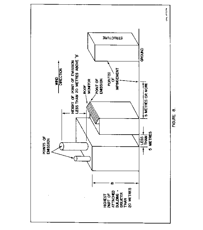 (ii) the height of the highest part of the building or structure on which the point of emission is located is greater than twenty metres above grade and the point of emission is less than twenty metres above the highest part of the building or structure on which it is located, or (see figure 8)
