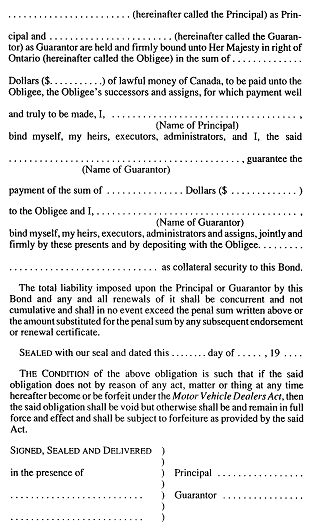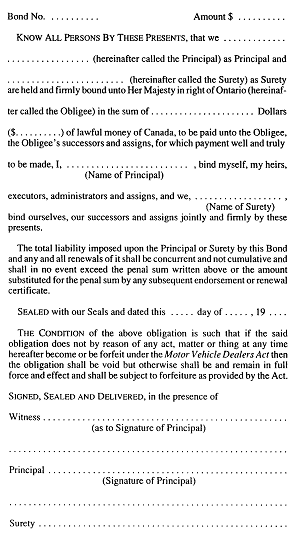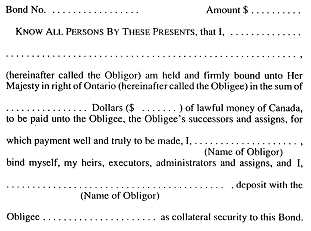 (5) The bond referred to in subsection (1) shall be in Form 1, Form 2 or Form 3, as the case may be. R.R.O. 1990, Reg. 801, s. 3 (5).