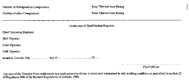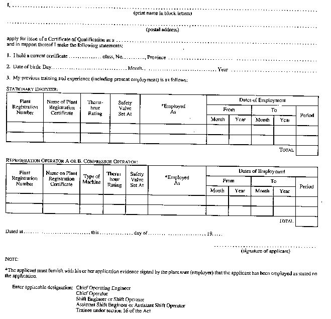 (c) furnish evidence from his or her employer stating that he or she has had at least four years of qualifying experience in a refrigeration plant of which not less than one year has been in a plant having a Therm-hour rating exceeding 10.176. R.R.O. 1990, Reg. 904, s. 10.