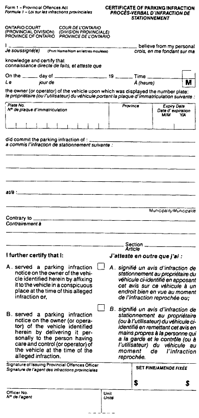 1. A certificate of parking infraction shall be in Form 1. O. Reg. 494/94, s. 1.