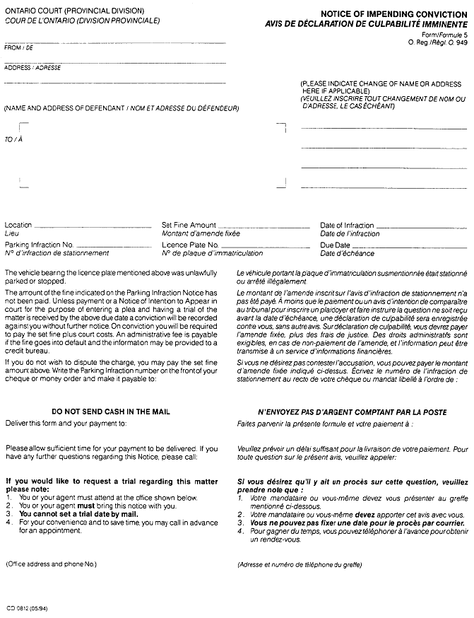 Notice of impending conviction/avis de déclaration de culpabilité imminente | |
