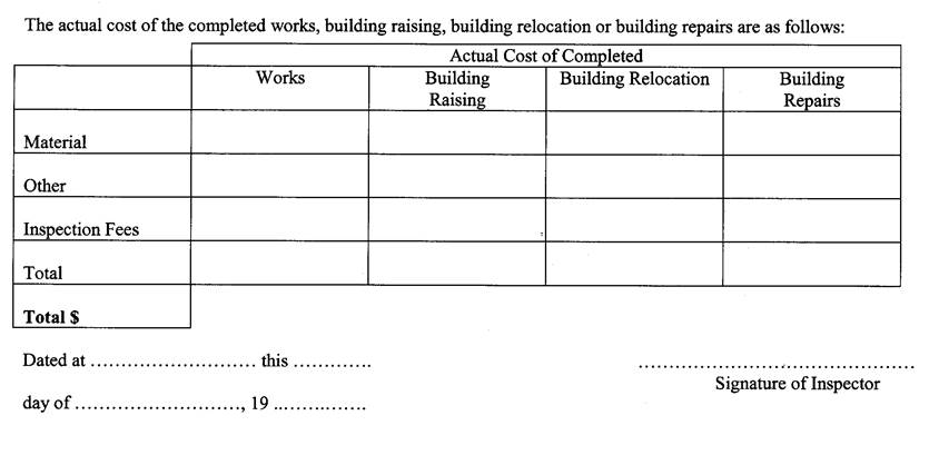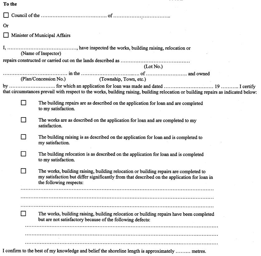 An inspector, employed by the municipalities listed below, has inspected the works or building repairs for which the proceeds of this debenture will be lent, and each has been completed in accordance with the terms of the loan approval given. A copy of the Inspection and Completion Certificate for each project in respect of which the Corporation will lend the proceeds of this debenture is attached hereto. |