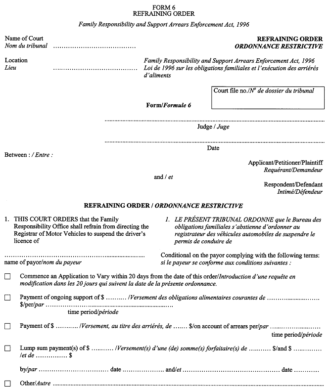 13.1 An order that the Director refrain from directing the suspension of a payor’s driver’s licence shall be in Form 6. O. Reg. 359/97, s. 2.