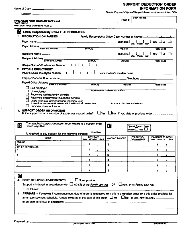 SUPPORT DEDUCTION ORDER INFORMATION FORM