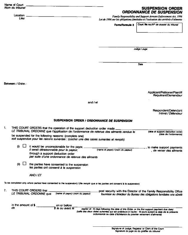 11. An order to suspend the operation of a support deduction order shall be in Form 3. O. Reg. 167/97, s. 11.
