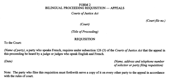 8. (1) In addition to the method described in section 7, a party may exercise the right under subsection 126 (3) of the Courts of Justice Act to have an appeal heard by a judge or judges who speak English and French by filing a requisition in Form 2 with the registrar or clerk of the court to which the appeal is taken,