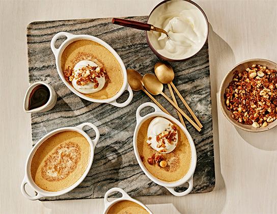 Serve topped with Ontario Maple Syrup, Maple Crème Fraîche or Crunchy Hazelnut Topping.