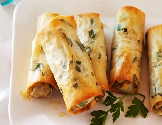 Cut pastry sheets vertically into three 5-inch (12 cm) wide strips. Discard leftover thin strips. Mound about 2 tbsp (25 mL) filling, 1-inch (2.5 cm) from bottom of 1 strip. Pat filling into log shape, leaving 1/2-inch (1 cm) phyllo border on both sides. Fold in both long sides of phyllo strip, about 1/2-inch (1 cm) wide, bringing them up and over filling ends. Lightly brush folded sides with butter. Fold bottom edge of phyllo strip over filling and roll up. Brush roll with butter and place seam side down on nonstick baking sheet. Repeat process twice more making 9 rolls. Bake in 375°F (190°C) oven until golden, 13 to 15 minutes. Serve warm.