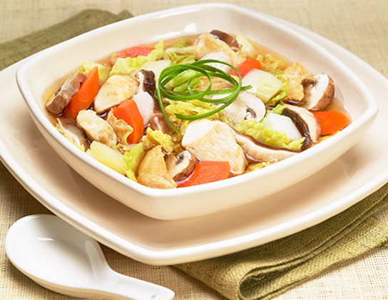 Add chicken broth, soy sauce, sugar, carrots, potatoes, mushrooms and cabbage; bring to boil. Cover, reduce heat and simmer for 15 to 20 minutes or until vegetables are tender. Stir in water chestnuts (if using) and heat until hot.