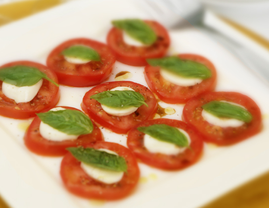 On platter arrange layer of tomato slices. Top with sliced cheese and basil (may need more than 1 slice of cheese depending on shape). Repeat once for individual plates. Just before serving, drizzle with oil and vinegar. Sprinkle with salt and pepper to taste. Garnish with chives.