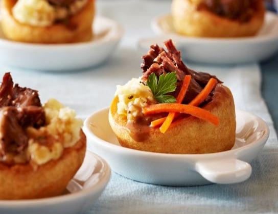 Fill each with rounded teaspoon (5 mL) of mashed potatoes, small dollop of horseradish and piece of roast beef dipped in gravy. Slice carrots into julienne strips and tuck at side of beef. Garnish with parsley leaf.